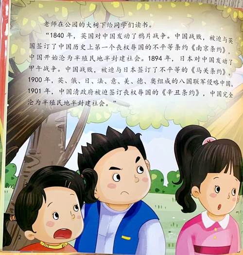老师在公园的大树下给同学们读书。 “1840年,英国对中国发动了鸦片战争。中国战败,被迫与英国签订了中国历史上第一个丧权辱国的不平等条约《南京条约》.中国开始沦为半殖民地半封建社会。1894年,日本对中国发动了甲午战争。中国战败,被迫与日本签订了不平等的《马关条约》。1900 年,英、俄、日、法、意、美、德、奥组成的八国联军侵略中国1901 年,中国清政府被迫签订丧权辱国的《辛丑条约》,中国完全沦为半殖民地半封建社会。"