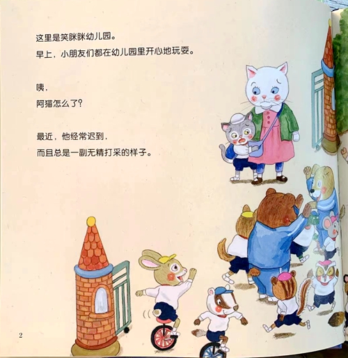 这里是笑眯眯幼儿园。早上,小朋友们都在幼儿园里开心地玩耍。
