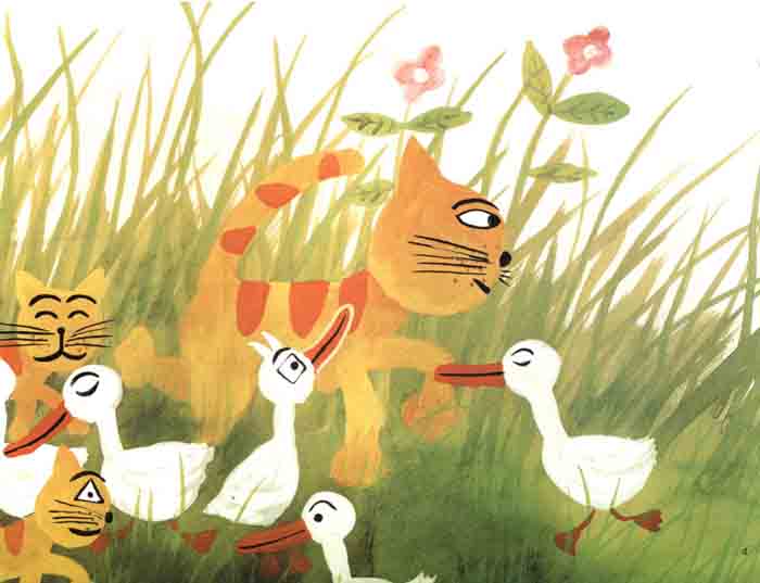 在图画书中,童话中出现的人物各有各的性格。把这些性格颠倒过来是十分有趣的。弱者变强了,做不到的事情做到了,困难解决了,使故事很有戏剧性。不过,稀里糊涂的小猫和小鸭的故事不是性格颠倒,而是讲了一个道理:小猫不会游泳,鸭子却很拿手;鸭子不会爬树,小猫却很拿手。这种自我发现成为孩子们成长的力量。