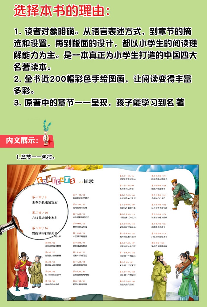 《水浒传》与《红楼梦》《西游记》《三国演义》并称为“中国四大名著”。它讲述了北宋年间,以宋江为首的一百零八位好汉先后聚义于梁山,替天行道,除暴安良的故事。书中故事曲折传奇,引人入胜;宋江、李逵、武松等人物形象刻画鲜明生动,颇具英雄气概。数百年来,《水浒传》的故事深受人们喜爱,在中国可谓家喻户晓,脍炙人口。