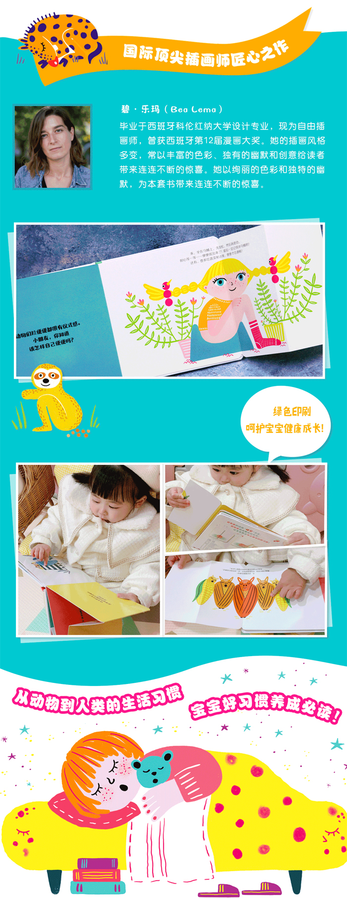一、别出心裁的创意拉页 带给宝宝无限乐趣! 该书在设计上采用的是可折叠的创意拉页,可谓能屈能伸,惊喜万分!每页设置的问题犹如谜题一样耐人寻味,轻松点燃宝宝们探索拉页背后的好奇心!在这里,“眼见”不一定“为实”,轻轻一拉,你会发现你所看到的部分只是冰山一角。相当考验宝宝们的想象力哦~ 二、令人捧腹大笑的动物常识 向宝宝们轻松科普认知盲点! 这套书在惊喜和爆笑声中向孩子们普及动物的生活习惯,又一边引导宝宝们养成正确的生活好习惯,替广大麻麻们减轻日常生活负担。简直一箭双雕,完美! 三、角色设定由动物过渡到人类 正确引导宝宝养成好习惯! 这套书共4册,分为《我想吃饭》《我想睡觉》《我想便便》《我想洗澡》。每本书描述完5种动物的基本生活需求后,后能自然而然地回归到人类宝宝身上,进而引导宝宝养成正确吃饭、睡觉、便便、洗澡的好习惯! 四、国际著名插画师匠心之作 该书由西班牙插画师碧·乐玛(Bea Lema)绘制,她毕业于西班牙科伦红纳大学设计专业,现为自由插画师,曾获西班牙第12届漫画大奖。 一套好玩、有趣、涨知识的书,不仅能让宝宝爱上阅读,还能协助广大新手爸妈解决不少育儿烦恼!希望这套书能为您和宝宝的生活中带来一些改变和乐趣。