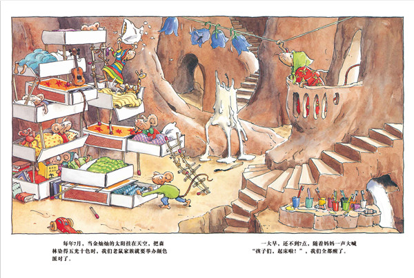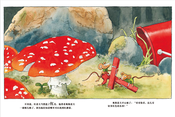 我是兰道夫。每年7月,我们老鼠家族都要举行一场盛大的颜色派对。妈妈先教我们识别各种颜色,然后我们就出发了去找相应颜色的东西了:快看!阮道夫划着一个橙色的漂流瓶找到一个大橙子,弗雷道夫和阿道夫用一根麦秆儿穿了一大串蓝莓……其他人都为颜色派对找来了什么呢?