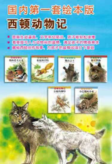 《绘本版西顿动物记》是儿童文学作品(无电子书目)。由日本作家小林清之介、画家清水胜等以西顿的动物文学作品为原型,针对较低年龄段儿童的阅读习性,合理改编之后而创作的一系列少儿绘本。包括《狼王罗伯》《公鹿的脚印》《松鼠的冒险》《我的爱犬宾戈》《小浣熊阿奇亚》和《熊山之王》共6册。本书生动而活泼地讲述了富有尊严而有灵性的动物世界,呈现了西顿动物文学中人与动物、动物与动物间无限的温情与爱意。文字引人入胜,饱含感情,图片精美逼真,可以发孩子的阅读兴趣,翔实的内容则可以满足孩子的好奇心和求知欲,寓教于乐,让孩子了解动物,并思考动物与人类的关系。