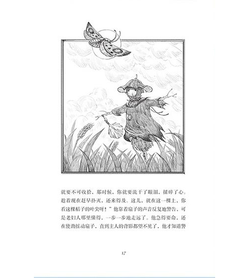 稻草人**尽责任。要是拿牛跟他比,牛比他懒怠多了,有时躺在地上,抬起头看天。要是拿狗跟他比,狗比他顽皮多了,有时到处乱跑,累得主人四外去找寻。他从来不嫌烦,像牛那样躺着看天;也从来不贪玩,像狗那样到处乱跑。他安安静静地看着田地,手里的扇子轻轻摇动,赶走那些飞来的小雀,他们是来吃新结的稻穗的。他不吃饭,也不睡觉,就是坐下歇一歇也不肯,总是直挺挺地站在那里。