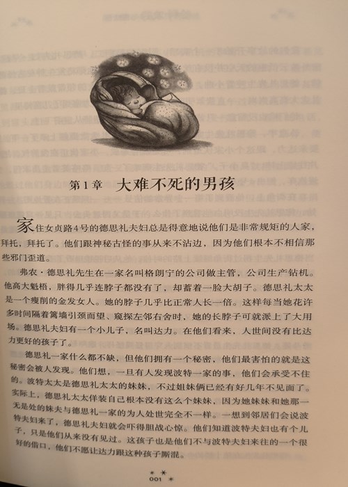 家住女贞路4号的德思礼夫妇总是得意地说他们是非常规矩的人家,拜托,拜托了。他们从来跟神秘古怪的事不沾边,因为他们根本不相信那些邪门歪道。