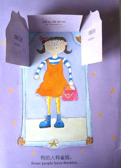也许你的头发又直又黑,眼睛是咖啡色的,而你的好朋友,却有着金色的头发和蓝色的眼睛。也许不少朋友戴眼镜,戴矫正器或脸上有雀斑,或者两样都有!每个人高矮胖瘦都不一样,兴趣和习惯也不一样。这本乐乐翻翻书用亲切又幽默的方式让我们看到各种各样的小朋友,书的最后有面神奇的魔镜,你可以照照自己。还有一张表格专门用来让你记录自己的特征。