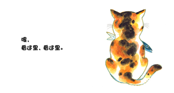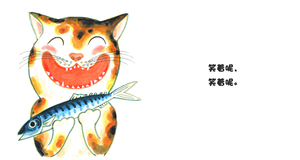 小猫背对着大家,干什么呢?“喂,看这里。”小猫捧着鱼,转过身来说:“笑着呢,笑着呢。”