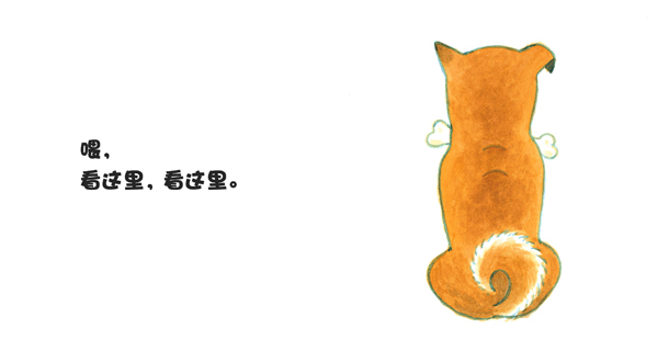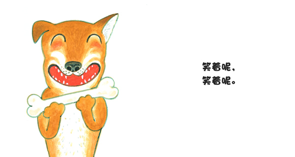 小狗背对着大家,干什么呢?“喂,看这里。”小狗叼着骨头,转过身来说:“笑着呢,笑着呢。”