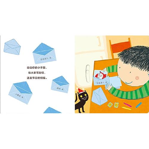 动动你的小手指,让藏在夜色中的眼睛悄悄睁开;动动你的小手指,给大家写封信,送去节日的祝福;动动你的小手指,让妈妈给你一个晚安吻;动动你的小手指,一起来玩躲猫猫吧......喵!没有比充满期待和收获惊喜更快乐的事了。宝宝通过每个页面上巧妙的滑轨,用小手一推一拉,有趣的景象不断出现,就像在玩一场纸上的“躲猫猫”游戏。随着不断出现,就像在玩一场纸上的“躲猫猫”游戏。随着不同场景的变化,宝宝亲身参与到与书的互动中,真正地成为阅读的主体,对周围的世界有了最初的认知。《夜晚来临》中展示了树林里的夜晚、草地里的夜晚、大海中的夜晚,家里的夜晚等不同的场景,强化宝宝对相关主题场景的认知。《睡着以后》中,通过一幕幕温馨的夜晚场景,让宝宝认知黑夜,克服恐惧。《圣诞树下》带宝宝体验完整的圣诞节,让孩子在*后收到礼物的快乐中对节日有了概念。《奇妙瞬间》则让宝宝通过滑轨,捕捉大自然中万千稍纵即逝的美景,培养孩子的观察力,鼓励孩子走进大自然,热爱大自然。
