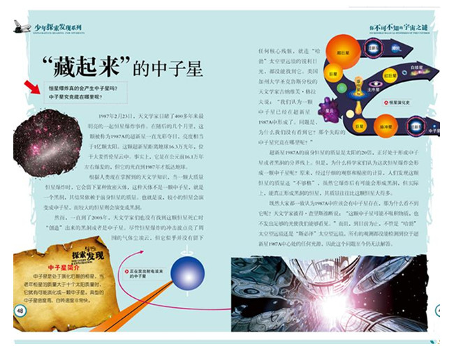 “少年探索发现系列”丛书在内容上囊括了宇宙、地理、自然、历史、人物、科技和艺术等领域,以故事的形式将各领域具有研究价值、探索意义的几百个世界未解之谜呈献给读者,帮助读者增长知识、开拓视野。《你不可不知的宇宙之谜》系统而全面地展示了一系列精彩有趣的宇宙谜团,设置了与内容紧密相关的宇宙方面的小知识。