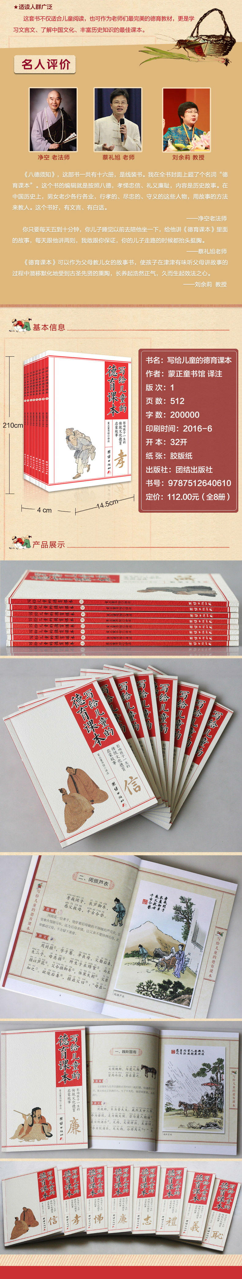 这套书不仅适合儿童阅读,也可作为老师们完美的德育教材,更是学习文言文、了解中国文化、丰富历史知识的课本