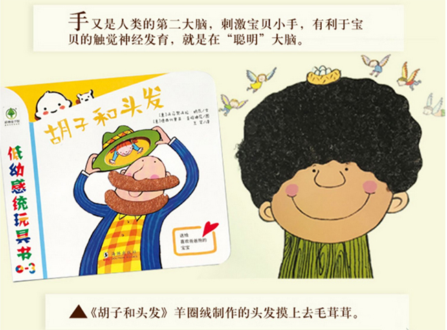 很多宝宝都喜欢摸爸爸的胡子,这本书,可以满足他们所有的好奇,可以摸到各种各样的“胡子和头发”!