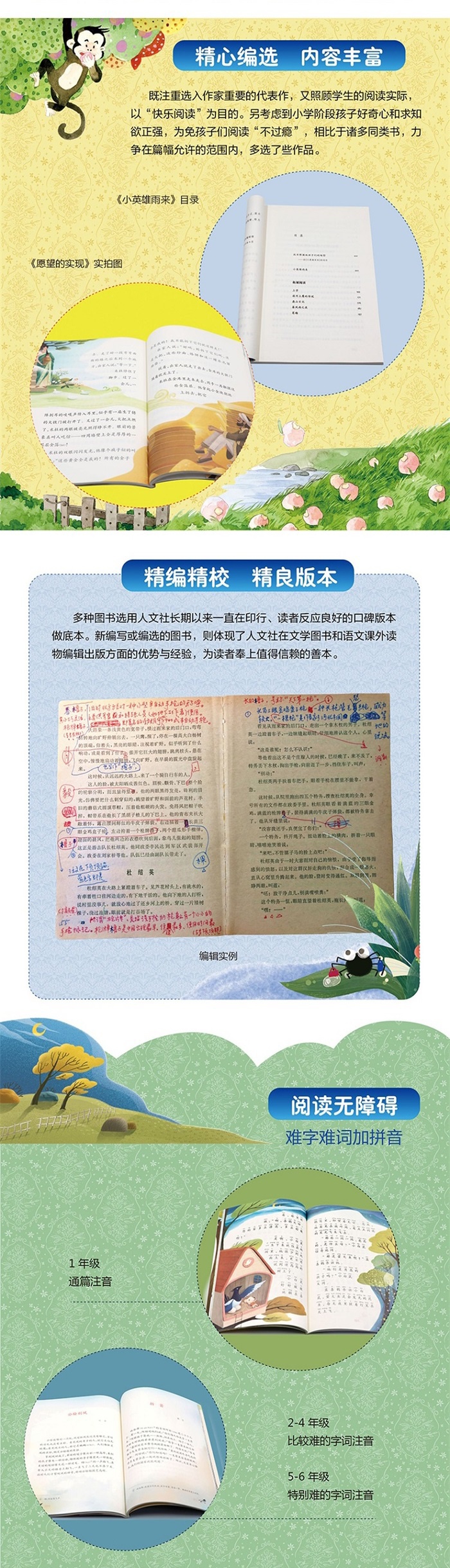 这是部编新课标对小学一年级阅读书目的补充。共编选适合一年级孩子读和听的诗歌、童话、民间故事、历史故事、寓言故事、生活故事等一百余篇,选篇经典,类别丰富,共分四册,每册60页左右,大字带拼音,个别生僻词带注释,适合一年级幼童的阅读习惯。