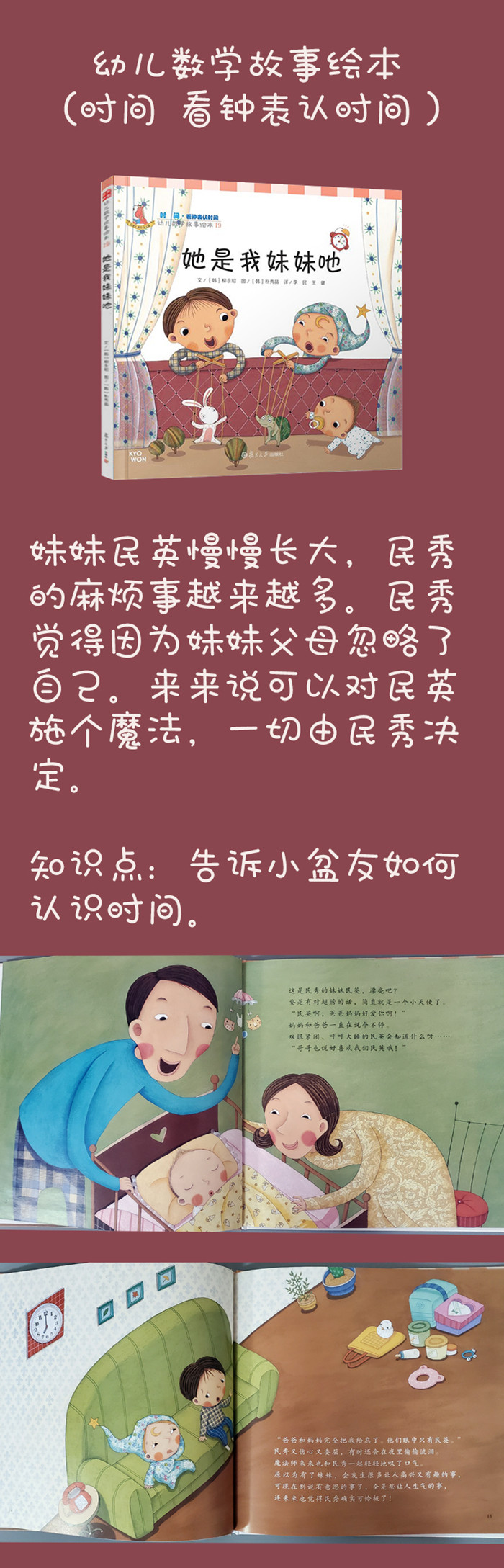 本书告诉孩子们如何认识时间。如果没有钟表,我们就不能有规律地生活,如果没有星期、月、年等时间单位,我们的生活也会失去计划,杂乱无章。故事讲述了 随着妹妹民英的慢慢长大,民秀的麻烦事越来越多。因为民英的存在,民秀更是觉得自己被爸爸妈妈忽略了,为此民秀心里很不是滋味。看着一脸苦闷的民秀,来来说如果民秀愿意的话,可以对民英施个魔法。来来让民秀在3点之前决定,可是民秀的心像一团乱麻,不知如何是好。看着熟睡中的民英,民秀终于意识到自己是那么地喜欢民英妹妹。故事生动有趣,图画细腻靓丽,故事能启发儿童的思维发展。