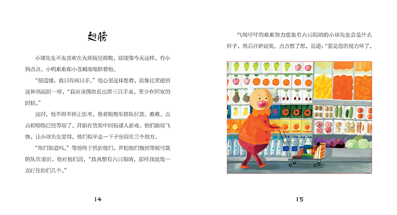 樱桃街上新搬来一位奇怪的先生,他每天系不同颜色的领结,他身子圆滚滚,脑袋圆滚滚,鼻子圆滚滚,连名字也圆滚滚——他叫“小球先生”。谁也不知道小球先生做什么工作,有人说他是个退休的杂技演员,有人说他在家开了个玩具修理店,还有人说他是个巫师——这个说法不太可信,因为小球先生没有长胡子、尖帽子,更没有魔法棒。更让人们好奇的是,小球先生和几只动物住在一起:会说话的小鸭难难、小狗点点,还有整天嗡嗡叫的小苍蝇嗡嗡。