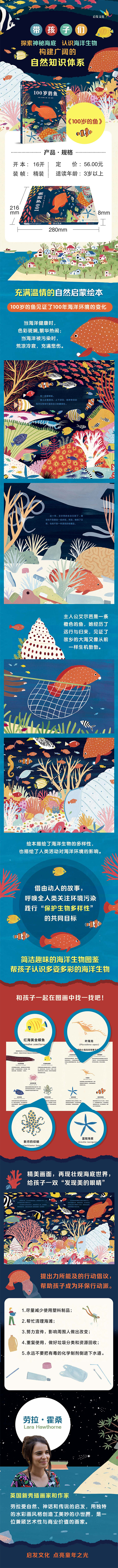 艾尔芭是一条橙色的鱼,生活在海底的珊瑚城,这里曾经色彩斑斓、生机勃勃。艾尔芭一年年长大,周围的世界渐渐改变,朋友们纷纷离去。她则被困在一个塑料瓶里,随波逐流……直到一个在海边玩耍的小女孩发现了她。小女孩救了艾尔芭,还号召周围的人一起清理沙滩和海洋,让大海恢复了生机和色彩。艾尔芭终于回到珊瑚城,在这里庆祝了自己的100岁生日。本书以精美的图画表现了海洋环境的变化和多姿多彩的海洋生物,并在故事后的扩展内容对一些海洋生物做了详细介绍,还提出了小读者力所能及的环保行动倡议,是一本将故事、知识与艺术完美结合的海洋环保主题绘本。