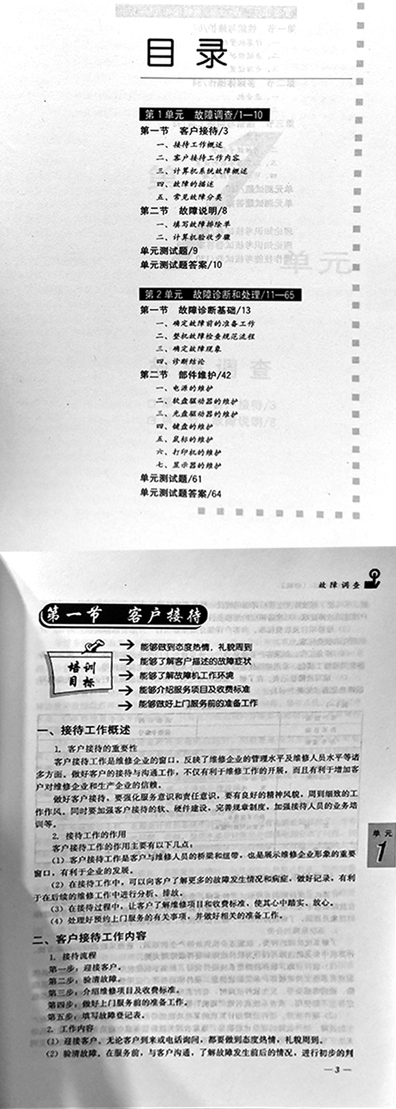 本教材由劳动和社会保障部教材办公室组织编写。教材以《国家职业标准·计算机(微机)维修工》为依据,紧紧围绕“以企业需求为导向,以职业能力为核心”的编写理念,力求突出职业技能培训特色,满足职业技能培训与鉴定考核的需要。 本教材详细介绍了初级计算机维修工要求掌握的*实用知识和技术。全书分为三个模块单元,主要内容包括:故障调查、故障诊断和处理、Windows系统操作。每一单元后安排了单元测试题及答案,书末提供了理论知识和操作技能考核试卷,供读者巩固、检验学习效果时参考使用。 本教材是初级计算机维修工职业技能培训与鉴定考核用书,也可供相关人员参加就业培训、岗位培训使用。