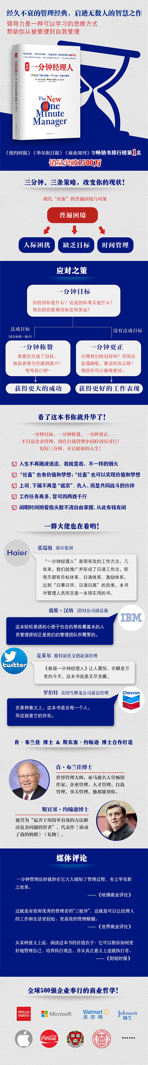 一位善于化繁为简的管理专家,一部开启领导秘诀的商业之作,一个事关所有人的成功寓言。 《新版一分钟经理人》是对经典畅销管理读物《一分钟经理人》的全新修订,世界一流管理大师在37年管理咨询公司的案例实践基础上,以寓言的形式阐述了*有效*实用的一分钟管理法,被奉为企业管理速成经典,成为世界500强企业高管的书。本书轻松易读简单实用,能让读者从被管理到自我管理,成功掌握自己的职业、生活和人生!