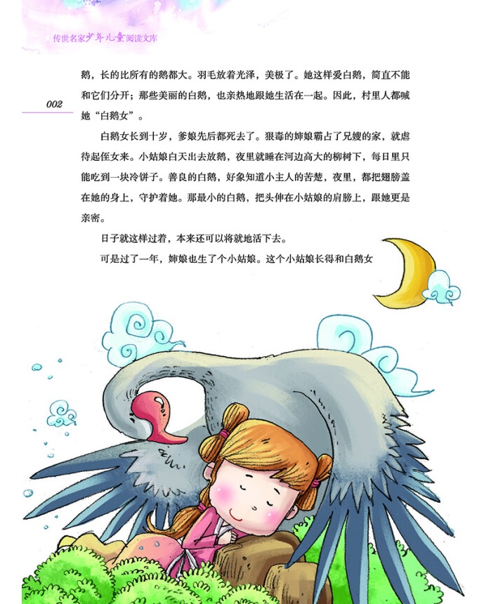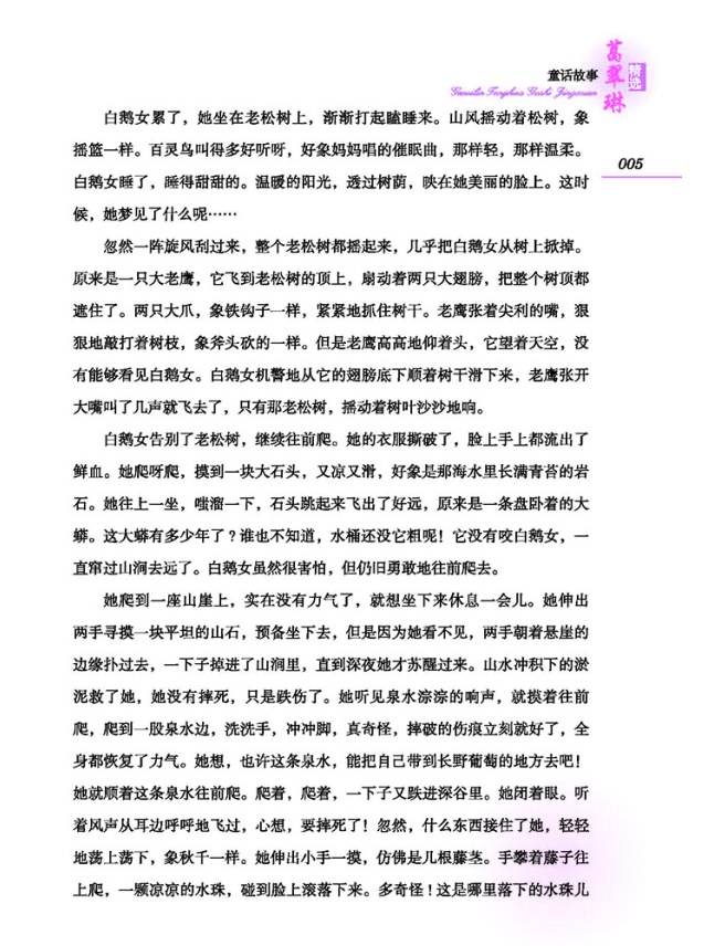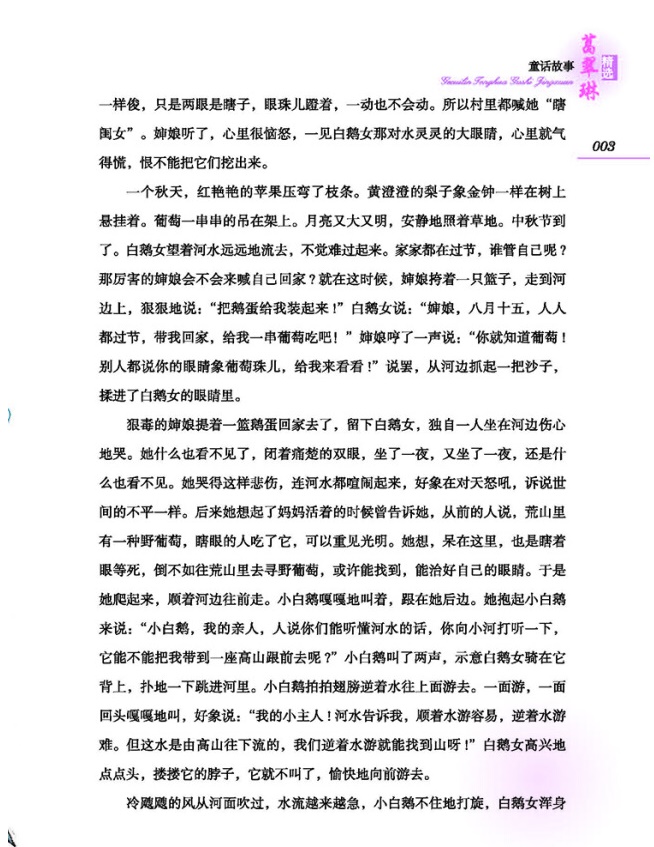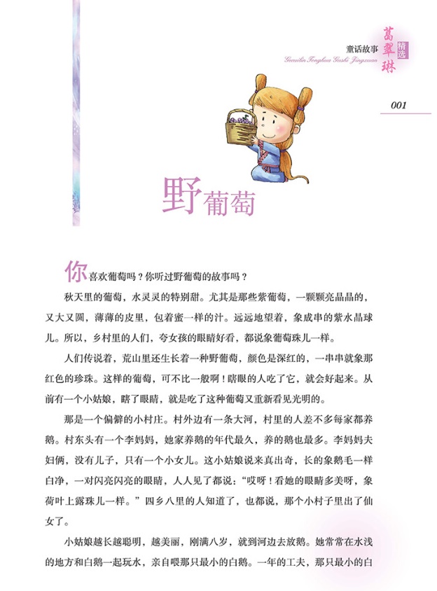 野葡萄 你喜欢葡萄吗?你听过野葡萄的故事吗? 秋天里的葡萄,水灵灵的特别甜。尤其是那些紫葡萄,一颗颗亮晶晶的,又大又圆,薄薄的皮里,包着蜜一样的汁,远远地望着,像成串的紫水晶球儿。所以,乡村里的人们,夸女孩的眼睛好看的时候,都说像葡萄珠儿一样。 人们传说着:荒山里还生长着一种野葡萄,颜色是深红的,一串串就像那红色的珍珠。这样的葡萄,可不比一般哪!瞎眼的人吃了它,就会好起来。从前有一个小姑娘,瞎了眼睛,就是吃了这种葡萄又重新看见光明的。 那是一个偏僻的小村庄。村外边有一条大河,村里的人差不多每家都养鹅。村东头有一个李妈妈,她家养鹅的年代最久,养的鹅也最多。李妈妈夫妇俩,没有儿子,只有一个小女儿。这小姑娘说来真出奇,长得像鹅毛一样白净,一对闪亮闪亮的眼睛,人人见了都说:“哎呀!看她的眼睛多美呀,像荷叶上的露珠儿一样。”四乡八里的人知道了,也都说:“那个小村子里出了仙女了!” ……