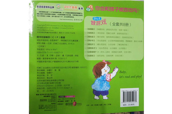 “读绘本做游戏”丛书是韩国原版引进书,由韩国教元文化集团制作,热销韩国,是一套为0-3岁宝宝量身打造的游戏绘本。绘画精美,游戏有趣,通过这些有趣的游戏,能够增进父母与孩子的亲切交流,提升宝宝的想象力、观察力,锻炼宝宝动手能力、身体协调能力,并培养宝宝的卫生习惯和环保意识等,是父母和宝宝“一起玩耍,一起快乐”的不二选择!本册是通过妈妈面对脏兮兮的宝宝,装作不认识并猜测他是谁的游戏,来巧妙地教育孩子注意个人卫生。通过这种游戏,可以锻炼孩子的观察能力和生活自理能力,养成良好的卫生习惯。