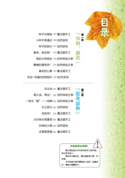 一本自然、环境教育手册,有许多简单易行活动指引,教给你如何带着孩子去探索自然、实践环保;它是一本优秀的儿童读物推介,相信每一个年轻父母,都会禁不住找来原书、读给孩子听;它还是一本充满“魔法”的手工制作指导,让孩子们在自然中、在游戏中,不知不觉地锻炼创造力和动手能力。