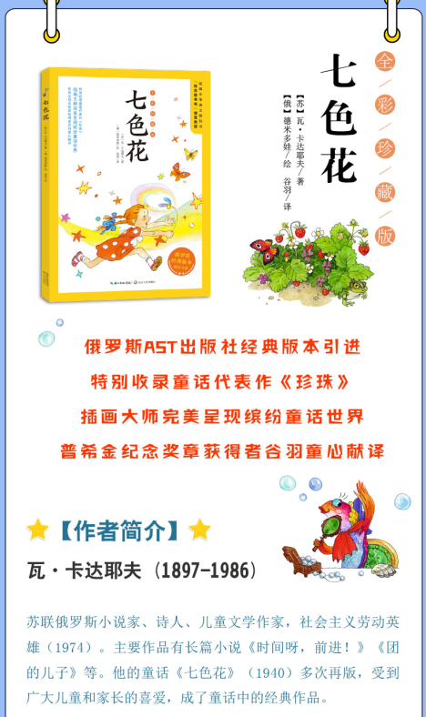 本书是瓦·卡达耶夫的童话集,收录了作者的两篇最为经典的作品《七色花》和《珍珠》,向孩子们宣扬了真善美。《七色花》的故事是围绕小姑娘珍妮和她的七色花展开的,珍妮用七色花掩盖了自己的错误、达成了自己因愤怒、嫉妒等自己的负面情绪产生的种种愿望,但珍妮并未因此得到真正的快乐,最后一片花瓣,她用来帮助他人,并从中找到了真正的快乐。译者是普希金奖章获得者谷羽。