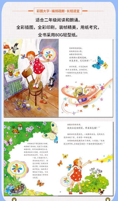 二年级下册语文教材“快乐读书吧”指定阅读,含《七色花》《一起长大的玩具》《大头儿子和小头爸爸》《愿望的实现》《神笔马良》。编排疏朗,赏心悦目,装帧精美,用纸考究适合二年级阅读和朗诵。