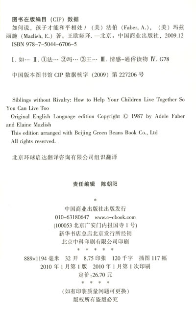 法伯和玛兹丽施在这本以她们的亲身经历和父母们的真实故事为基础的书中,详尽地展现并剖析了孩子们之间争斗不休的真相和根源,以及如何让孩子们和平相处的态度和言语。运用技巧性的语言,你就能在孩子们的战斗打响之时,不再感到灰心沮丧、疯癫抓狂或是无奈无助,而是可以从容应对,化孩子们之间的干戈为玉帛。