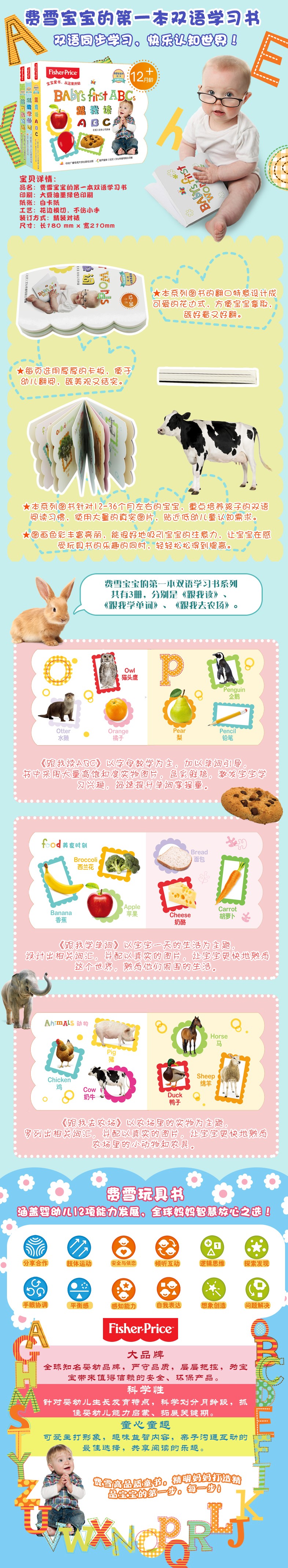 费雪宝宝的*本双语学习书系列引自美泰公司原著的费雪幼儿读物,本系列图书针对1236个月左右的宝宝,重点培养孩子的双语阅读习惯,使用大量的真实图片,贴近低幼儿童认知需求。本书《跟我学单词》以宝宝一天的生活为主题,设计出相关词汇,并配以真实的图片,让宝宝更快地熟悉这个世界,熟悉他们周围的生活