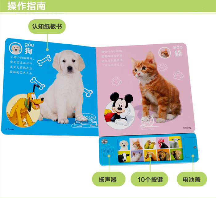 这一套由迪士尼明星带领宝宝认识身边事物的音效认识书。旨在给孩子一个更加新颖的学习方式,通过孩子常见的卡通人物引导,让孩子在玩乐的同时学习,通过声音和照片的双重刺激,培养孩子的注意力和集中能力,提高孩子的认知水平。。声音、照片、和儿歌的三位合一,能全方面的培养孩子的听觉、视觉和语言学习的能力,让每个宝宝都是一个全面发展的快乐儿童。