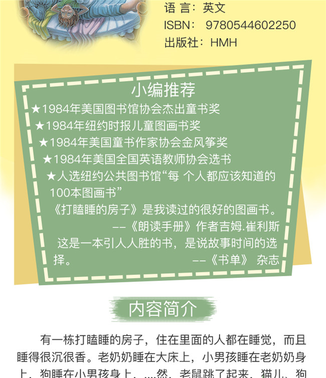 有一栋打瞌睡的房子,住在里面的人都在睡觉,而且睡得很沉很香。老奶奶睡在大床上,小男孩睡在老奶奶身上,狗睡在小男孩身上,......老鼠跳了起来,猫儿、狗儿、小孩儿一个个都惊飞了起来,老奶奶还压垮了.....家都醒来了,打瞌睡的房子里没有人在睡觉了!