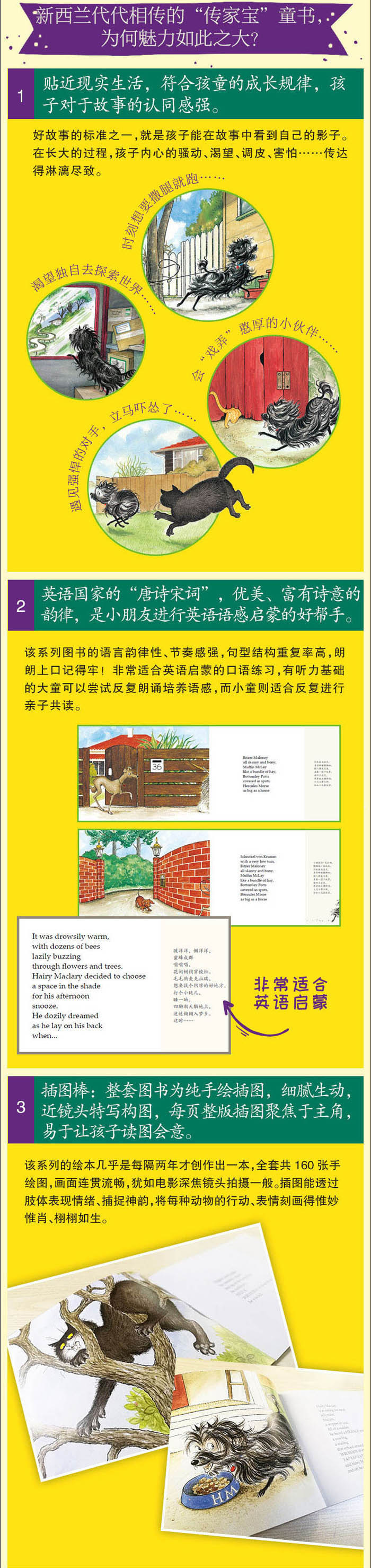 “毛毛狗麦克拉瑞和朋友们”系列绘本,是新西兰作家林俐?达德久负盛名的作品。作家塑造出这个整天调皮捣蛋、麻烦惹不完的灵魂人物,再搭配栩栩如生的插图,让这只狗从纸上呼之欲出。一根骨头就能让毛毛狗知足不已,顺利躲避群狗的围追堵截后又是满心的得意;一条链子束缚了它的自由,这就是他全部的烦恼;在暖暖的阳光下睡个够,幸福也莫过于此了;偶尔把家里折腾得天翻地覆也是别有趣味。小猫小狗的生活在成人看来似乎再简单不过了,可是透过它们澄澈的双眼看到的却是一个色彩斑斓的世界,那里充满冒险、惊喜,有着享受不尽的乐趣。他们像孩子一样童真可爱,鲁莽调皮,而且具有冒险精神。