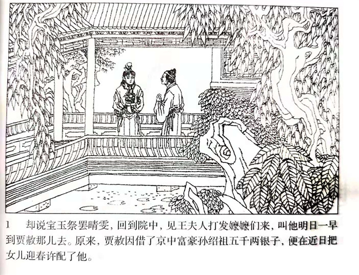 贾赦因欠孙绍祖千两银子,便把迎春嫁给这个恶徒。贾政重提宝玉上学之事,并且亲自把宝玉送到贾府学堂。迂腐的贾代儒以师长的身份对宝玉进行了一番训诫。