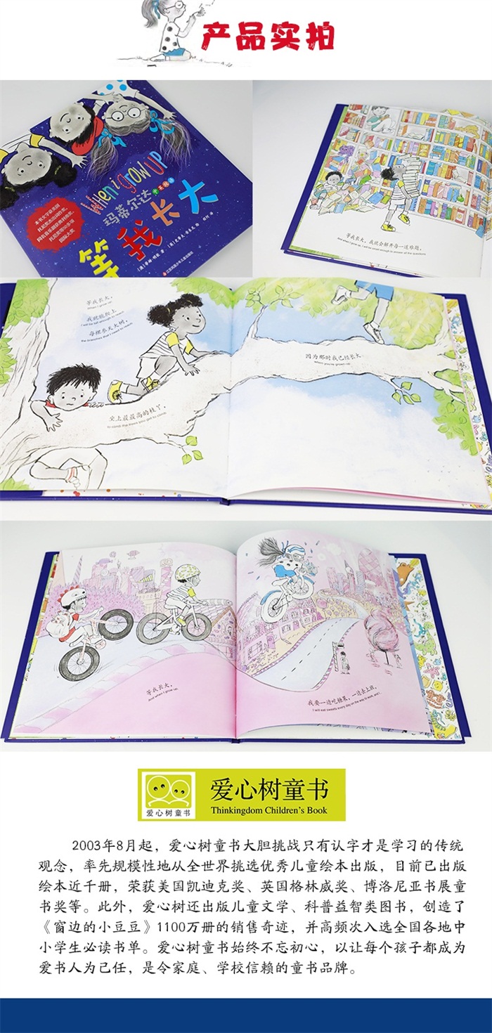《等我长大》是写给每一个孩子的故事,也是写给每一个成年人的歌。无论读者是小朋友还是成年人,都会被这本书感动。对于小读者来说,这是对成人世界的期待和幻想。每个小朋友都曾像书中那样幻想:“等我长大了,我一定要……”。小时候总被大人警告“小孩子不能这样”,“小孩子不能那样”,“等你长大了你就能……”,仿佛长大了就什么都能做。所以小朋友总是盼望着尽快长大,长大了以后就可以想吃多少糖果就吃多少,想看多久的卡通片就看多久。而这本书就是描述的小朋友这样的期待,是孩子们天真无邪的童年梦想。