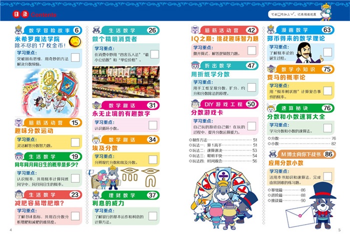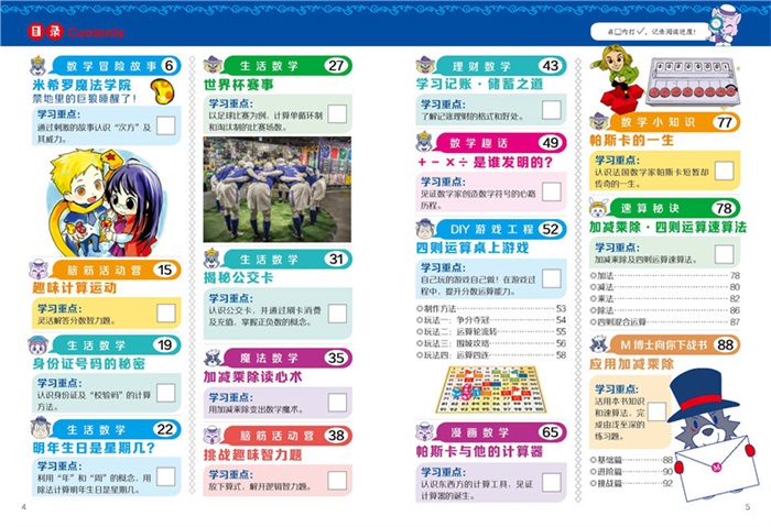 1、六大数学主题,集中提升数学核心能力:思维能力、应用能力和运算能力 学习数学概念,掌握速算方法,学会应用诀窍,玩转小学数学! 2、延续畅销儿童文学IP,《大侦探福尔摩斯》和你一起快乐学数学! 畅销儿童文学IP《大侦探福尔摩斯》 作者厉河亲自操刀;Q版人物穿插介绍数学知识,活泼有趣,更容易吸引孩子学习兴趣。大侦探福尔摩斯和朋友们,陪你一起勇闯数学世界! 3、紧扣小学数学教材内容创作,教材匹配度95%以上 对应小学数学各年级知识点,按主题划分,让孩子学好、用好数学知识! 4、内容丰富、多元,每册都有故事、生活、趣味、知识四大板块,让孩子智商、财商双提升,数学能力飙升! 在魔法学院里发生的神奇冒险故事,巧用数学解难题。看漫画,穿越时空,去认识历史上的数学名人。生活中的种种问题,比如,明年生日是星期几?怎样计算食物中的卡路里?等等,都能用数学找到答案,做个会生活的小达人。从微观的个人理财到宏观的金融调控,有趣事例带孩子零基础学理财,养成理财好习惯。各种数学智力题,让你动动脑筋,轻松一下。还有超实用“速算秘诀”,教你解题新思路,省时又省力!