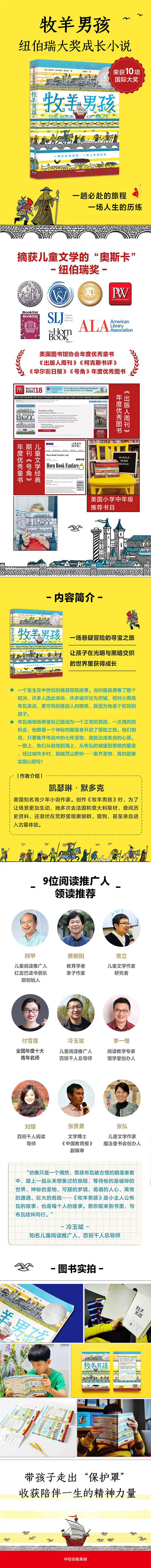 2019年纽伯瑞儿童文学奖银奖 美国图书馆协会年度优秀童书 《柯克斯评论》年度优秀童书 《学校图书馆期刊》年度优秀童书 《号角》年度优秀童书 《出版人周刊》年度优秀童书 《华尔街日报》年度优秀童书 《书单》杂志编辑选择奖 芝加哥公共图书馆年度优秀童书 专业书评网站BookPage年度优秀童书 一个身负秘密的孩子,一个来历不明的朝圣者,两个看似完全不同的人,是什么让他们能成为相互扶助的旅伴,完成一场危机四伏的冒险?两位主人公为了集齐圣物而展开的这场冒险,也是一场在黑暗中寻找光亮的心灵的探索。 书中的“连串插入式”故事结构使读者不断地遇见新的人物和他们的故事,情节充满张力,而每一个角色的故事都像是一则简短的寓言,让读者窥见一个光明与黑暗交织的世界,并让我们跟着小主人公磨炼成长,学着读懂黑暗,心向光明。