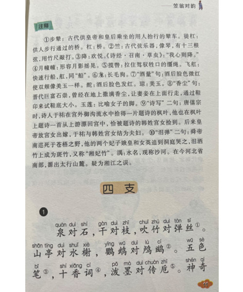 《笠翁对韵》是从前人们学习写作近体诗、词,用来熟悉对仗、用韵、组织词语的启蒙读物。全书分为上下卷。按韵分编,包罗天文、地理、花木、鸟兽、人物、器物等的虚实应对。从单字对到双字对,三字对、五字对、七字对到十一字对,声韵协调,琅琅上口,从中得到语音、词汇、修辞的训练。从单字到多字层层属对,读起来,如唱歌般。较之其他全用三言、四言句式更见韵味。
