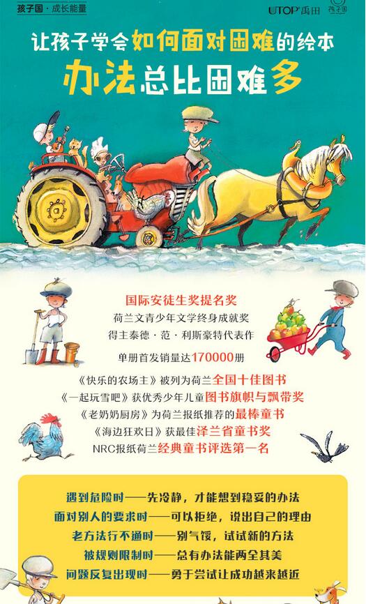 内容简介: 故事的主人公是一个叫弗莱迪的小男孩,他有一个农场、几台车,还有许多动物朋友。阳光、乐观又温暖的弗莱迪,对弟弟妹妹和农场里的一切都关爱有加。不管遇到什么难题,弗莱迪的应对态度始终如一,不抱怨、不焦虑,主动需求解决问题的办法,勇敢尝试与挑战。在这样的弗莱迪的弗莱迪面前,还有什么样的难题不能被解决呢? 在去市场卖菜的路上,弗莱迪被一个又一个路标阻拦:禁止步行进入、禁止自行车进入、禁止汽车进入……他还能顺利进入市场吗? 《老奶奶厨房》——转换思路可能会收获更多 果园大丰收,收获了数不清的苹果、梨子和李子。这么多水果,一下子可吃不完啊!有没有什么更好的解决办法呢? 《好想养大象》——坚持原则,又葆有爱心 表妹萨米捡到一头大象,她把大象打扮成各种模样,大象猪、大象羊、大象鸡……萨米能留下这头不属于自己的大象吗? 《海边狂欢日》——将不可能变出无限可能 显示全部信息