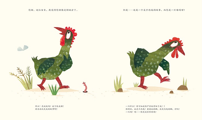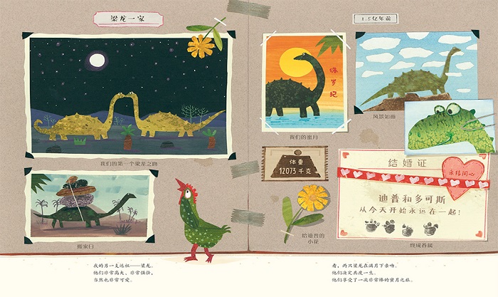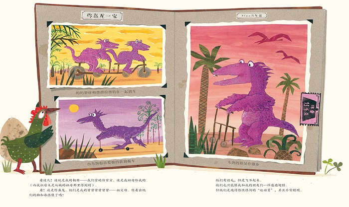 不同于其他恐龙科普读物,本书用家庭相册展示了恐龙和家人们一起度过的欢乐时光,传递出一种温馨、和谐的家庭观念,并巧妙地将真实可靠的恐龙知识融入整个故事。故事的主人公居然是一直母鸡,她自称是恐龙的后裔,并拿出她的传家宝——一本家庭相册,翻到她的祖先伶盗龙的照片,指出他们长着相似的脚和羽毛,后面又介绍了更远的亲戚,禽龙、梁龙、霸王龙等家族成员。随着小行星撞击和其他史前灾难的降临,恐龙的故事落幕了。骄傲的小母鸡昂首爬上梯子,去孵一只巨大的恐龙蛋。然而破壳而出的既不是可爱的三角龙鸡,也不是其他温顺友好的恐龙玩伴,而是满嘴尖牙的霸王龙!小母鸡吓得仓皇而逃。