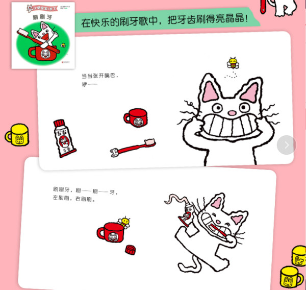 此外,“小猫宝宝1岁了”系列绘本中除了小猫宝宝,还有可爱的动物朋友们——小兔子、小熊、小猪、小狸猫,大家依次说早上好、道晚安,唱刷牙歌……这种反复的叙述形式能一遍遍加深孩子的印象,帮助他们学习语言。