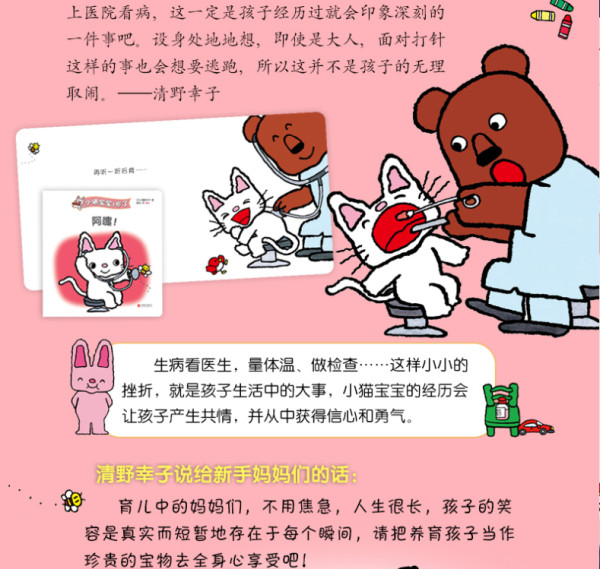 在这场成长的挑战中,宝宝会主动尝试,会遇到挫折,有笑声也有泪水。玩耍时被小伙伴撞疼了,哭过后擦干泪水,互相说“对不起”;感冒了就勇敢地去看医生,量体温、做检查……这些小小的挫折,就是孩子生活中的大事,小猫宝宝的经历会让他们产生共情,明白原来不只自己会遇到这些问题,不用担心、害怕,并从中获得信心和勇气。
