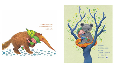 慢慢地,红毛狮子觉得绘本里的动物和小朋友们的拥抱甜蜜极了。他开始羡慕起来,他到森林里去找其他的动物拥抱,但是没有动物愿意,他是一只到处被拒绝的狮子。突然,他记起他也曾经有过类似拥抱的感觉,当他还是一只小狮子的时候,他是这样温柔地被一个小男孩抱着,拥有无限的温暖。他也想起分开的那一天,小男孩在路上狂奔,朝着载走红毛狮子的卡车使劲地挥手。