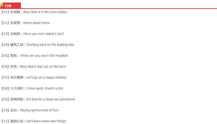 一本进阶版“小熊很忙” 由Nosy Crow精心选取“小熊很忙”系列中的素材,专为1-6岁中国孩子打造的英语单词启蒙认知书。 有11个孩子熟悉的生活主题:动物园、欢乐农场、水下世界、火灾抢险、建筑工地等。以场景联想的方式,引出孩子启蒙必需的500+基础单词。 插图活泼有 趣,每页都有可以互动的翻翻页、方便查找的小标签,并配有点读设计,可以边点边跟专业英文教师朗读。让孩子在熟悉的生活场景中、在丰富有趣的互动中,轻松认单词,爱上学英语!