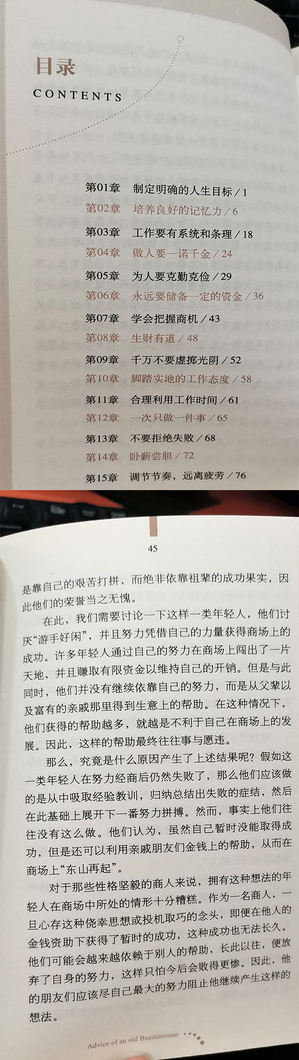 很多有能力的人,每天忙着做没有用的事,很多看起来没能力的人,却做了无数有用的事。后者因为懂得忠告的力度,改变了自己灰白的命运,所以造就了有用的人生。我要告诉你,成功有捷径,当然这捷径绝不是整个过程,而是站在前人的肩膀上,瞭望忠告的指向标,然后去做。 年轻人,成功的秘密就在于此,就在这些“至简”且“至深”的信条之中。如今,我把它们毫无保留地传授给你,愿你在经商之路上少走一些弯路,尽早抵达成功的彼岸,成为你想要成为的人。 记住,一个人可以轻易地失败,但只有他付出所有的一切和所能做的一切时,他才可能成功。 一位商界前辈的倾心指点和忠告—— 明确的人生目标 坚定的成功信念 脚踏实地的态度