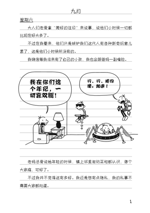 《小屁孩日记》是一本漫画与涂鸦加上文字说明的另类日记。主人公格雷是一个刚上初中的小屁孩。他心地善良,勉强算得上诚实,有那么一点小聪明,天性爱玩,因为外表的欠缺,只好狠练内功,希望通过自己满脑子的鬼点子吸引大家的眼球。全书以生活化的口吻和笔调、令人发噱的笑料和滑稽的插画,入木三分地刻画出一个“时而天真、时而叛逆、时而顽皮、时而无奈”的青春期男孩形象。该书通过格雷的口吻对美国中学生的学习、生活环境进行了一个近距离的真实描绘,无形中有一种解密的感觉,让我们的孩子发现原来远在万里之外、大洋彼岸的少年们也都是充满烦恼、冲动、善良的小屁孩,颇有“同一片蓝天、同一本书”的感觉。另外,作者采用随意而简朴的叙述方式,简化了生活的繁琐,短短几行字就提炼出个性鲜明的人物、笑料百出的情节,对孩子的写作和创新思维的开拓未尝不是一种帮助和启示。