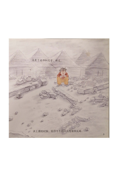 牛牛是灾难的幸存者。尽管幸存,牛牛仍然很难过。没有了家园,难过;老师和同学不在了,难过;再也不能和好朋友一起踢球了,难过;见不到爸爸、妈妈,难过。灾难带来的这一切如何让一个孩子承受和摆脱,扯不开的“难过”时时刻刻缠绕着他。 故事中失去双亲的虎子的出场,为大孩子牛牛缓解悲伤提供了一个转折,使他能够从无尽的缠绕中破开一个口,注意到在自己的悲伤之外还有别人的悲伤,更大的悲伤,更大的痛苦。虽然牛牛是在不知不觉中,承担起照料虎子的生活起居和疗伤的一切事情,但从照顾虎子到连带帮助其他需要帮助的伤员、老人,无形中转移了牛牛对自身悲伤的过多关注。这种注意力的分散,逐渐缓解了他对灾难的痛苦感受,也体现了自己对他人的价值和意义。而懵懂中的虎子虽然还在一刻不停地喊“疼”,没完没了地麻烦着牛牛,但小哥哥的陪伴无疑也部分地填补了他亲人缺失的深洞。
