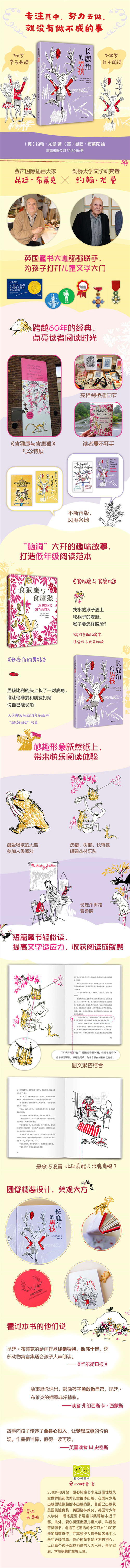 ★剑桥大学文学研究者写给孩子的幻想故事 ★昆廷·布莱克精妙绘制插画,扩展孩子的想象空间! ★专注其中,努力去做,就没有做不成的事 ★入选澳大利亚维多利亚州三四年级书单 ★男孩比利的头上长了一对鹿角,谁让他非要和朋友打赌说自己能长角 ★《长鹿角的男孩》告诉孩子全身心投入可以让梦想成真。故事相当棒,值得一读再读。——英国读者 M.史密斯 ★故事悬念迭出,鼓励孩子勇敢做自己。——Goodreads 西蒙斯 推荐 ★《长鹿角的男孩》充满想象力,将一个看似不可能实现的梦想照进现实!故事欢快有趣,孩子们会笑个不停!——“故事怪兽”网站 达伦·沃菲 推荐