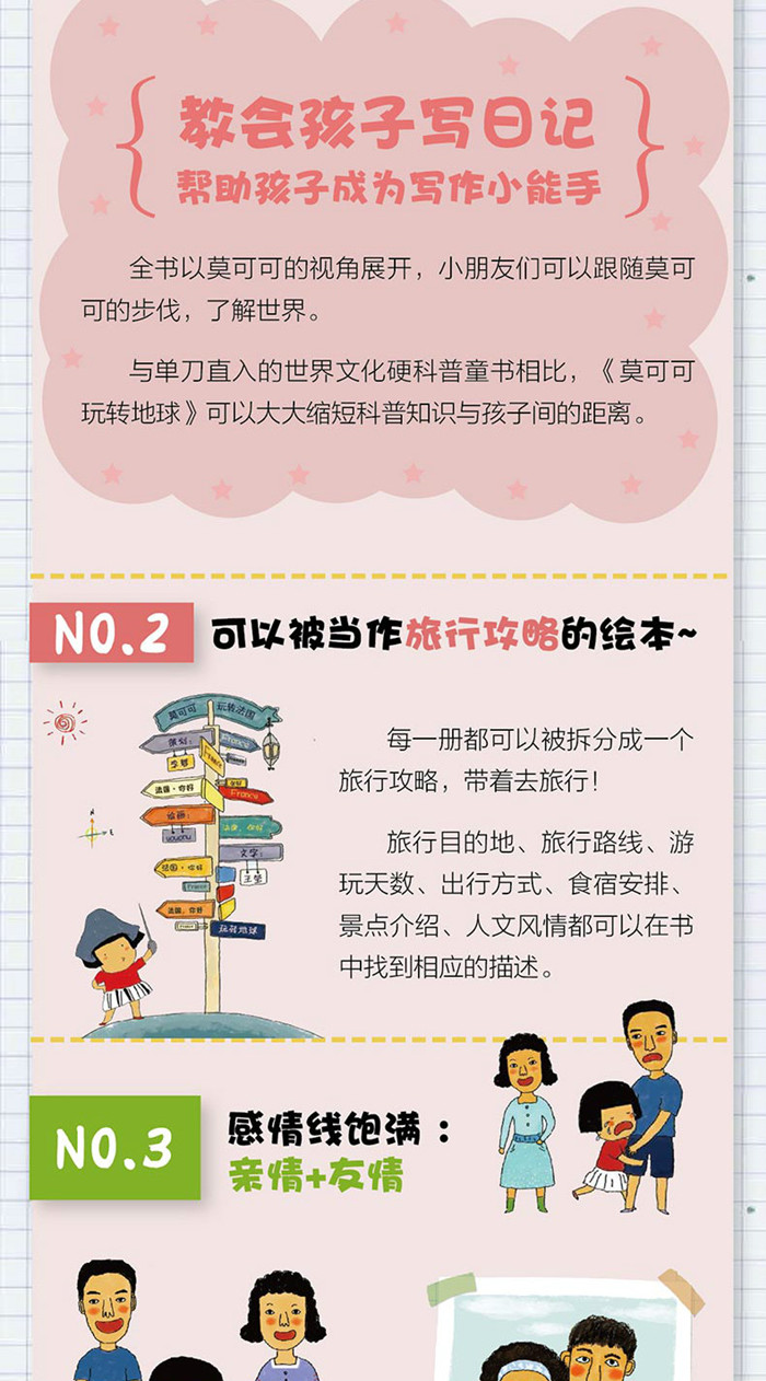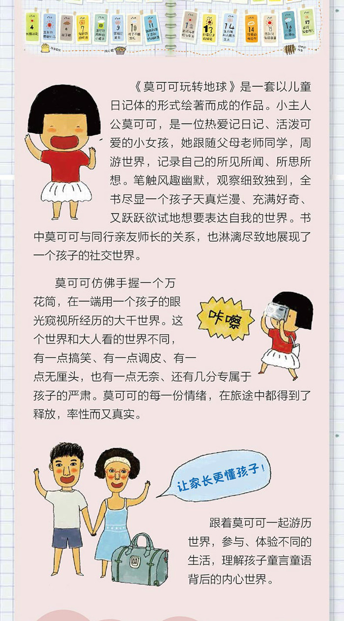莫可可跟随爸爸妈妈去国外旅行,她把自己一路的见闻画成了旅行日记,不仅有每个国家的自然风貌、风土人情,还有旅途中遇到的人,以及发生的小故事。 现在就让孩子跟随莫可可的脚步,在纸页间触摸城市的历史,沿着大街小巷去细细品味城市的人文积淀吧。旅行目的地分别为:日本、法国、芬兰、土耳其、马来西亚、西班牙、尼泊尔、澳大利亚。