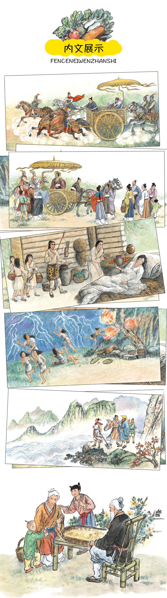 每个孩子的童年都不该错过的中国经典故事。《水墨中国绘本系列·经典故事》包括《大禹治水》《嫘祖养蚕》《愚公移山》《尧舜让位》《姜太公钓鱼》《燧人钻木取火》6册,大禹治水三过家门而不入,嫘祖智慧识蚕蛹,愚公坚持不懈移山,姜太公钓鱼愿者上钩,……均能带给孩子启迪。本套书为水墨画风,加上有趣的故事,让孩子完全浸润在传统文化中,将传统文化的种子深深地植于他们的记忆深处。本套书突出国画水墨工笔的绘画技法,又结合现代儿童审美形式重新演绎,中国国画风格。水墨感浓郁,用色鲜艳,更符合儿童审美。