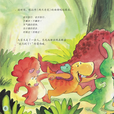 最后要说的,是系列图画书的最大亮点:这是一套可以边读边唱的图画书,每个故事里都穿插了两小段诗歌,一首出现在小恐龙遇到挫折、出现心理波动的时候,另一首则出现在问题得到解决、心情豁然开朗的时候。我在以往给孩子们读书的过程中总结有这样的经验:孩子们最喜欢在听一个故事的过程中,穿插一小段能唱起来的儿歌,她们会跟着唱,而且会非常开心。于是,在翻译这些小诗时,我特意和出版社的编辑一起寻找了一些中国家长比较熟悉的欧美儿童歌曲,把诗歌处理成歌词的形式套用进去,并力求词句的上口和节奏、韵律的合拍。我们希望爸爸妈妈在给孩子读书的时候,真的能开口唱起来。也许我们自己唱歌“五音不全”,没有关系,只要满怀信心地大声唱出来,孩子们一定会非常开心,他们才不在乎自己的爸爸妈妈唱歌是不是“跑调儿”呢,而且很快也会参与其中。亲子共读,共唱,这样其乐融融的景象,是不是很令人向往?